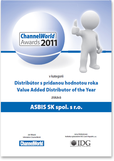 10 February 2011, Prague (Czech Republic) – ASBIS Slovakia has took astonishing 65% of the votes in the second “ChannelWorld Awards” annual survey held by IDG Czech Republic and became obvious winner in the category “Value Added Distributor of the Year 2011 in Slovakia”.